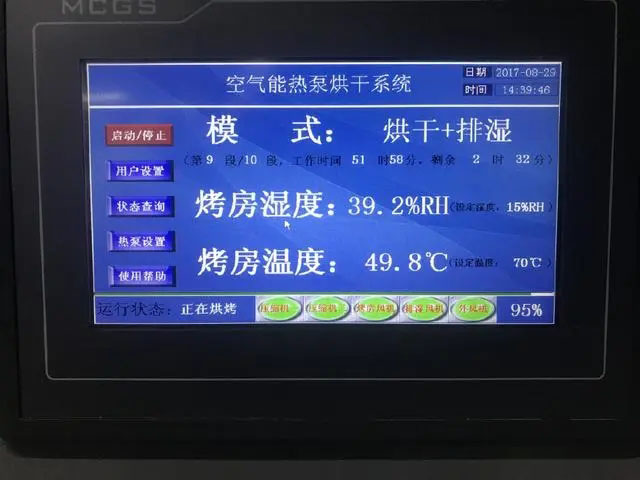 步驟二:新鮮山楂片的含水率約為80%,干燥的目標含水率約為13%,使用空氣能熱泵型烘干機,將智能溫度設定為55攝氏度左右的范圍,使山楂片所含的游離水大量蒸發,熱風循環系統不斷輸送新風,將風量均勻的輸送至各層架,排風,促使蒸發的水份通過凝結水管路系統排出。