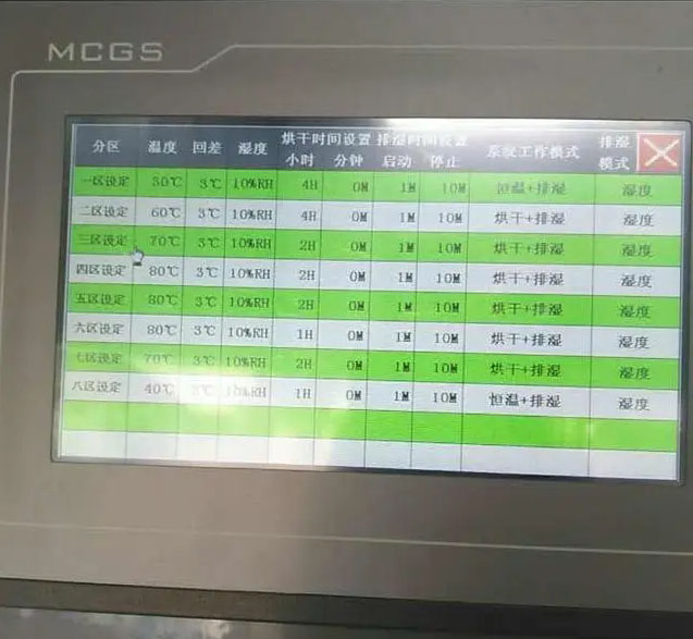 步驟三:山楂片的烘干過程比較簡單,山楂片耐受溫度較高,吸熱較大,可以從第一階段就將溫度升到60度,需要2-3小時完成,然后升到65度除濕,山楂水份較多,一般排水管的流水時間會到16小時左右,然后進行尾段的鞏固階段,一般需要2小時。