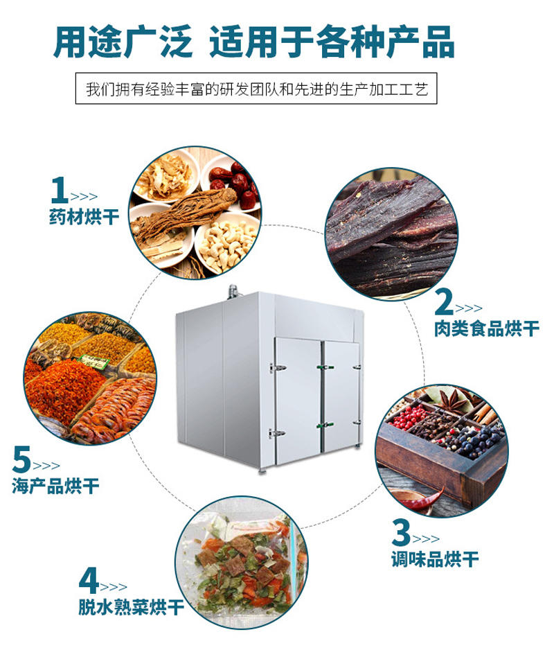 我公司全自動(dòng)智能化烘干機(jī)主要用于:農(nóng)副產(chǎn)品,提高其經(jīng)濟(jì)價(jià)值,增加出口創(chuàng)匯。果蔬、果脯、肉制品、腸衣、煙葉、皮革、枸杞、烘干蔬菜類(辣椒等)、食用菌類(香菇、蘑菇、木耳等)、中藥材類(金銀花、枸杞、人參、八角等)、海產(chǎn)品類(魚、蝦、魷魚、海帶等)、鮮果類(大棗、荔枝、桂圓、核桃等)、干果等的烘干。我公司機(jī)組能效比高,經(jīng)濟(jì)節(jié)能、安全穩(wěn)定。實(shí)現(xiàn)一機(jī)多用,提高烘干機(jī)的利用率。