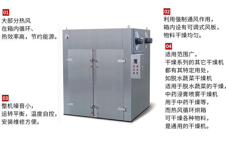 4、熱風雙向循環、熱量多次利用,烘干效率高、均勻性好、節能效果明顯。