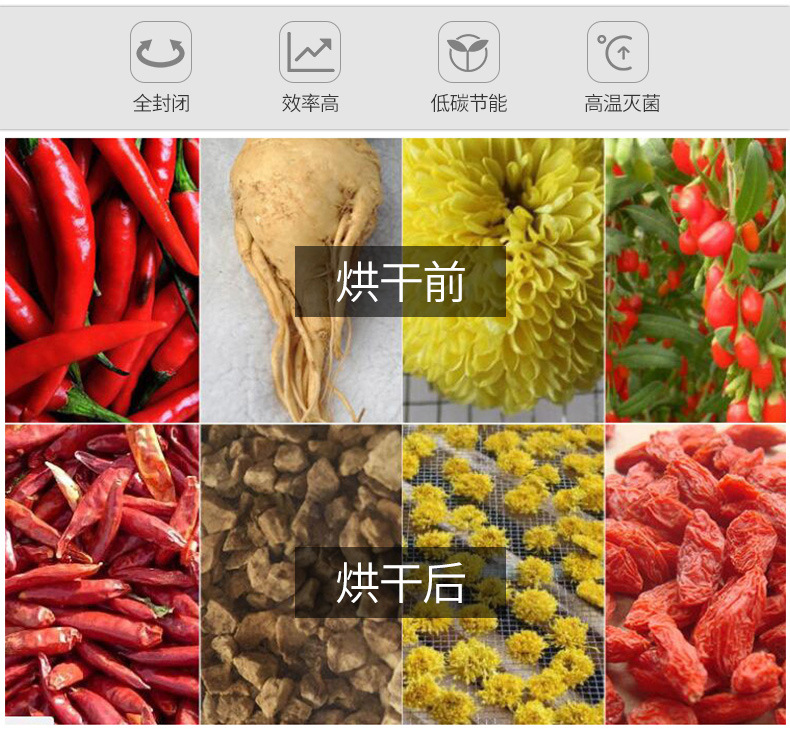 我公司全自動(dòng)智能化烘干機(jī)主要用于:農(nóng)副產(chǎn)品,提高其經(jīng)濟(jì)價(jià)值,增加出口創(chuàng)匯。果蔬、果脯、肉制品、腸衣、煙葉、皮革、枸杞、烘干蔬菜類(lèi)(辣椒等)、食用菌類(lèi)(香菇、蘑菇、木耳等)、中藥材類(lèi)(金銀花、枸杞、人參、八角等)、海產(chǎn)品類(lèi)(魚(yú)、蝦、魷魚(yú)、海帶等)、鮮果類(lèi)(大棗、荔枝、桂圓、核桃等)、干果等的烘干。我公司機(jī)組能效比高,經(jīng)濟(jì)節(jié)能、安全穩(wěn)定。實(shí)現(xiàn)一機(jī)多用,提高烘干機(jī)的利用率。